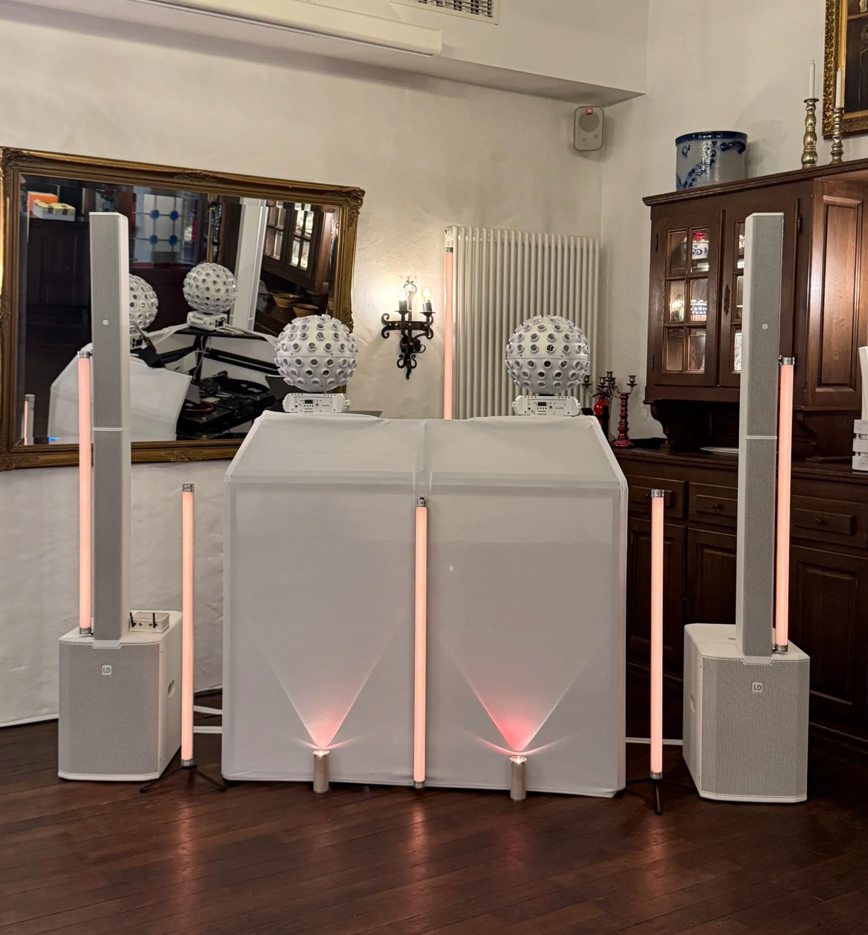 Technik, die klingt – und gut aussieht. Hochwertig, dezent, zuverlässig: klare Sprachverständlichkeit, druckvoller Sound, stimmungsvolles Licht. Weiße oder schwarze Säulen-PA, sauberes Kabelmanagement und schlanke Lichtelemente sorgen für einen professionellen Look.